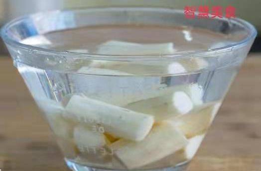 5、再籌備一根兒淮山藥,削皮再切塊狀兒,隨後放進冷水中泡著。