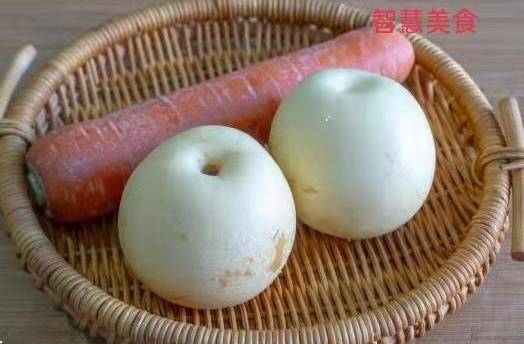 6、然後再提前準備2個雪梨和1個紅蘿卜,雪梨先削皮,再切片去核,切完後也加清水泡起來,防止空氣氧化發黑。