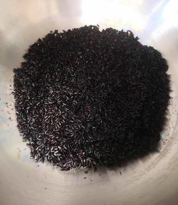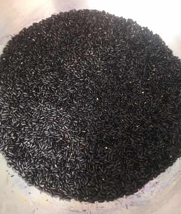 黑米洗凈後控幹水份再放進無水無油的鍋裡。