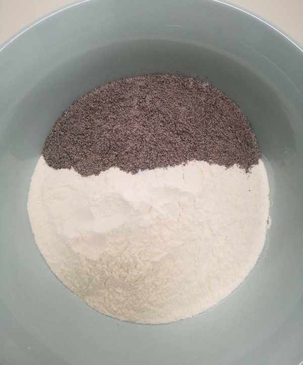 碗中加入黑米面粉和小麥面粉,比例為1:4或者1:5都可以,我用1:4。
