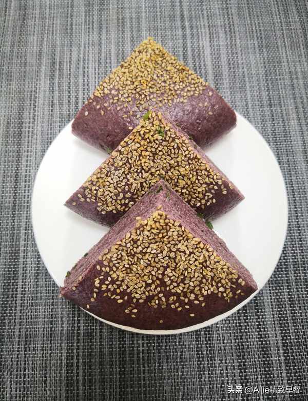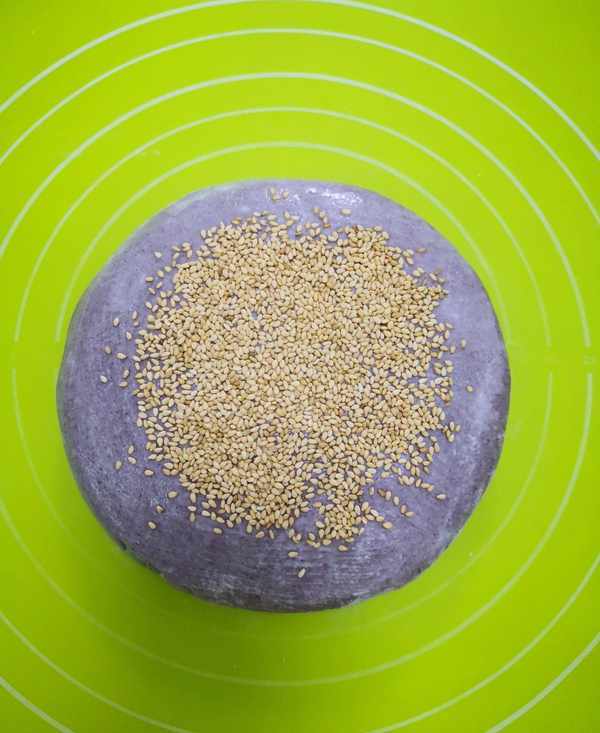 撒上熟白芝麻,用搟面杖稍微搟一搟,可使芝麻粘得更牢固,不易掉落。