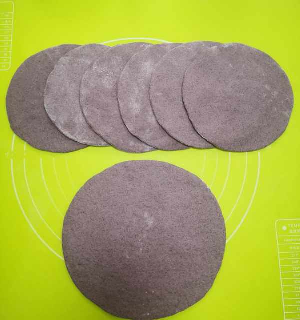 4.把小面劑子都搟成厚度約為1毫米且大小均勻的圓面片,可以對照面板上的圓圈搟,便於搟圓。
