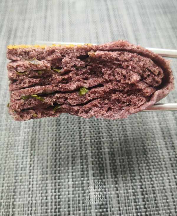 1/2.把最大的面片鋪在底部,刷少許薄油酥後撒上蔥花。