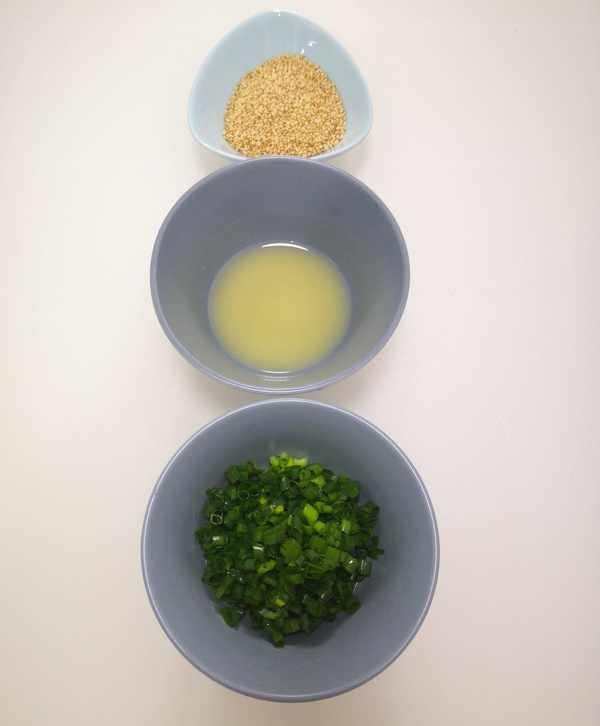 準備熟白芝麻;香蔥的蔥青部分切成小圈;少許幹面粉加放涼的熟食用油,少加點鹽調成稀面即油酥,建議少許幹面粉就行,這樣我們用很少的油就能調成稀面糊狀,少油更低能量。
