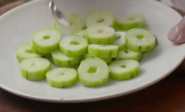 3、黃瓜片在挖孔時,要根據蝦的大小來進行,孔過大,會使蝦在後續的加工過程中脫落;
