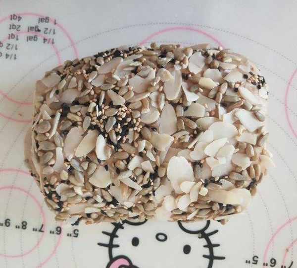 第10步、面團表面噴少許水,沾滿堅果材料。