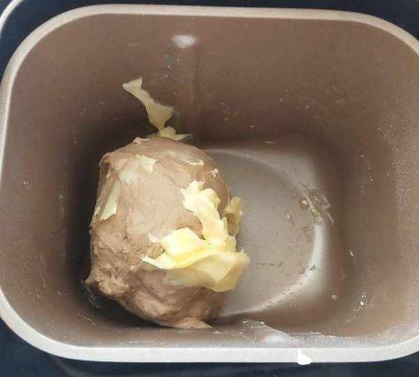 第3步、一個揉面程序(10分鐘)結束後加入黃油,再啟動一個揉面程序繼續揉。