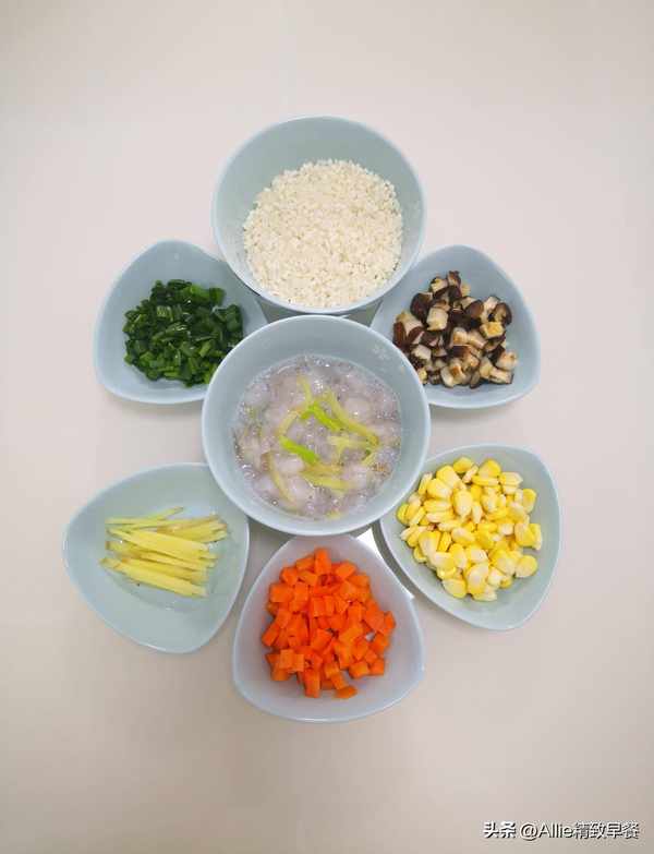 蝦尾、蔥薑水、蔥花、薑絲、香菇、玉米、胡蘿卜、大米、糯米