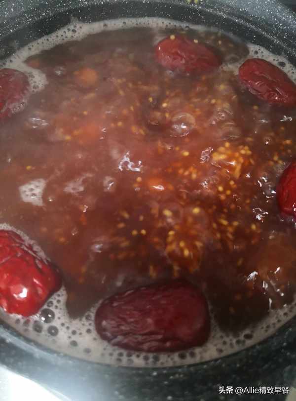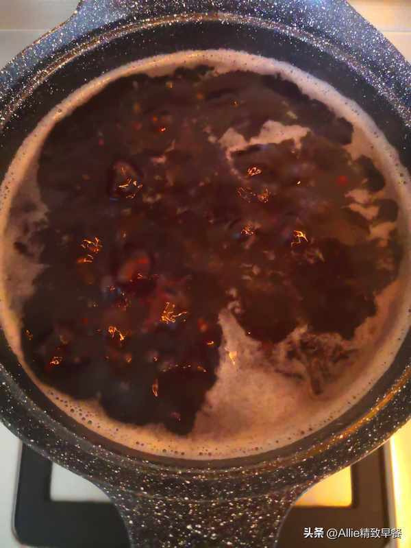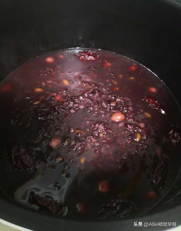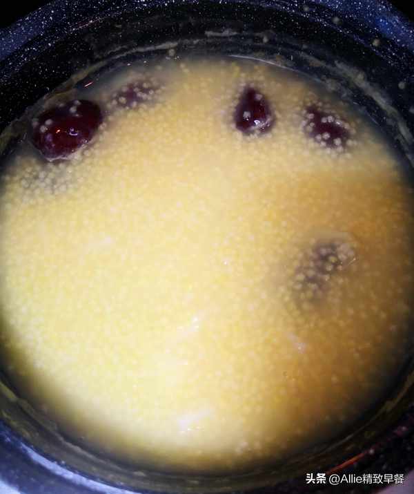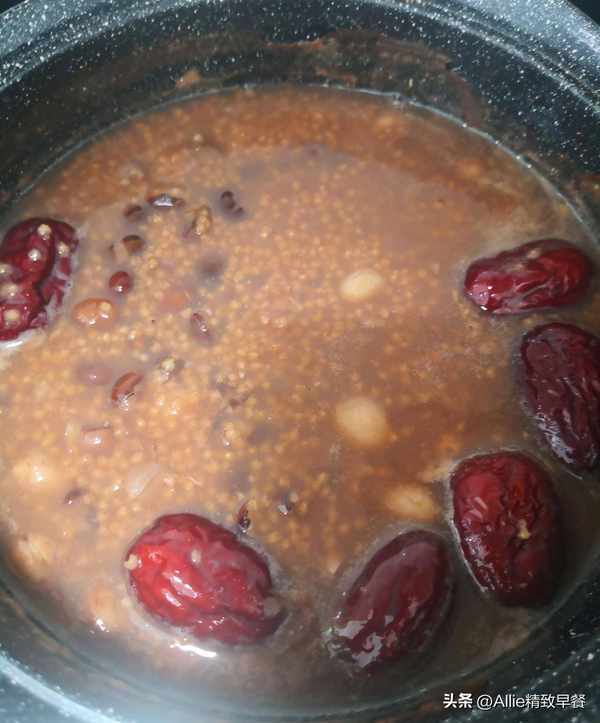 煮至紅豆快要軟爛時倒入淘洗幹凈的小米、紅棗,大火煮開轉中小火。