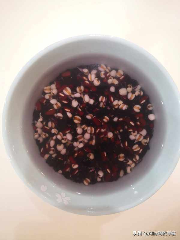 把紅豆、紫米、黑米、薏仁米清洗幹凈後用涼水泡一夜。