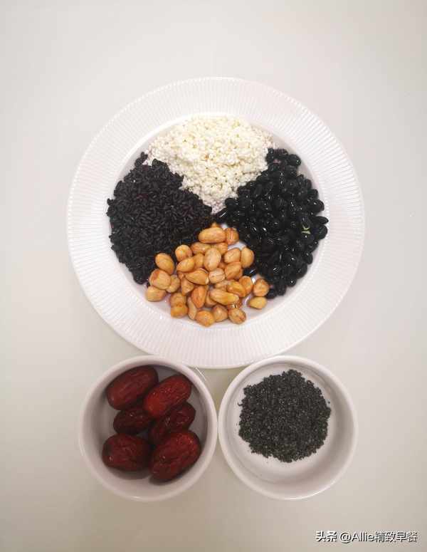 黑豆、花生洗凈後加涼水浸泡一夜,黑米和糯米無需浸泡,隻需稍微淘洗下即可;黑芝麻洗凈後控幹水分再放鍋裡炒至啪啪響,盛出涼再磨成粉,準備幾個紅棗洗凈備用。