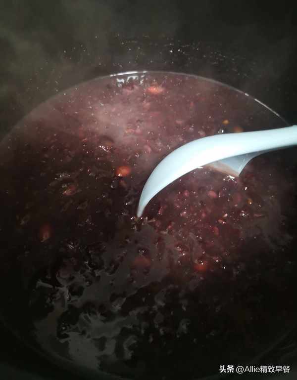 4.這次我是用電飯鍋煲粥的,沒有預約,是早起現煮的,現做現吃可較大程度地保住營養素,因電飯鍋熬粥時間較長,黑米沒有浸泡也能軟爛開花,如果是用燃氣灶煲粥,黑米也要浸泡,熟得快、口感好。