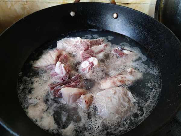 1.牛排骨剁成大塊後入清水中浸泡去血水,撈出入涼水鍋中,水開後撇凈浮沫撈出清洗幹凈。