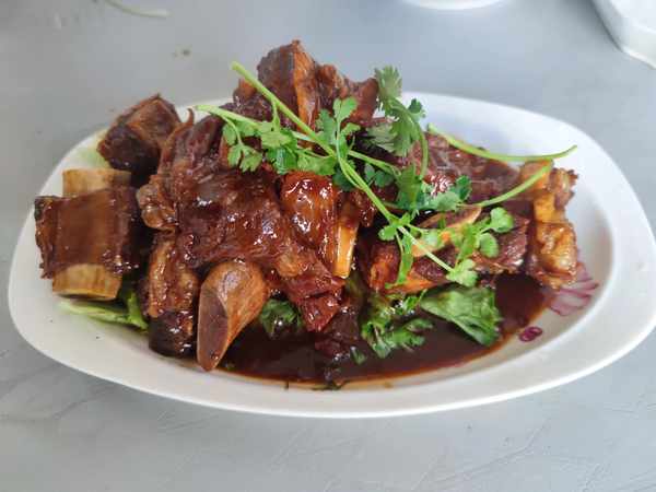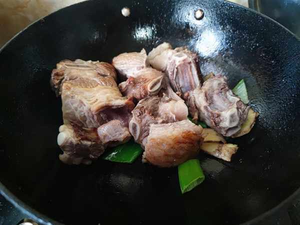 2.鍋中入油下入洗凈的牛排骨煸炒,把表面炒至金黃後,下入蔥薑蒜和幹辣椒爆出香味,烹入料酒和一品鮮醬油把牛排骨炒上色,加入白糖少許炒至白糖融化包裹住牛排,然後倒入一罐啤酒和適量清水沒過牛排。