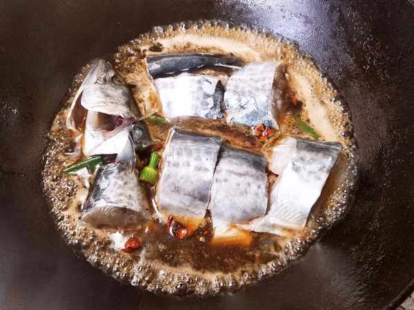 2.鍋中入油爆香蔥薑蒜、幹辣椒和一瓣八角,烹入料酒和一品鮮醬油後添湯,然後把鮁魚塊入鍋。
