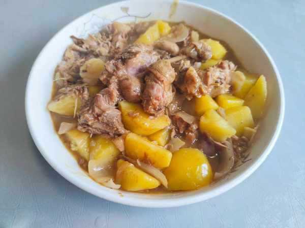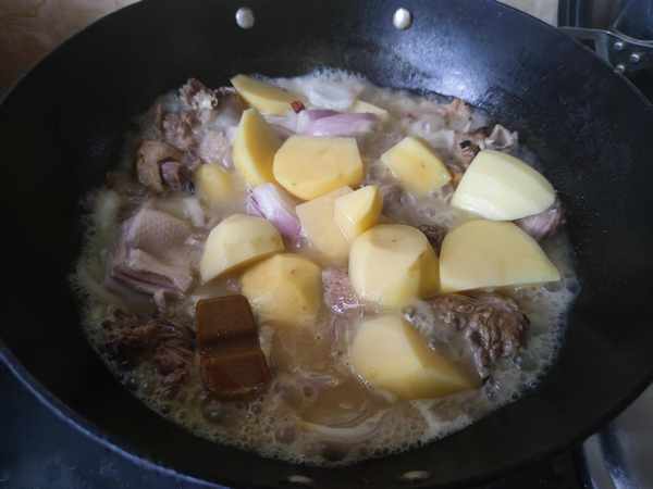 4.鍋中湯汁大火燒開後轉小火,下入土豆塊,放入一塊咖喱,燜燉至鴨肉軟爛湯汁濃稠後,開大火收濃湯汁即可出鍋。