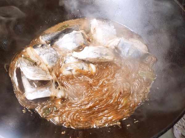 3.鍋中湯汁大火燒開後轉小火,下入白糖少許提鮮,加入泡發好的粉條用小火慢燉。