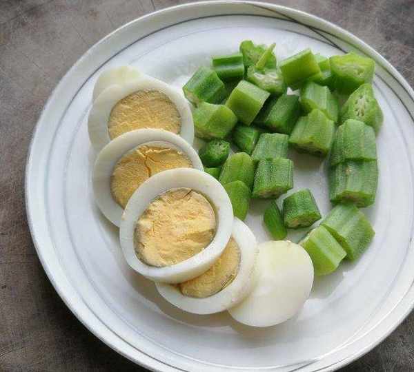 第4步、雞蛋煮熟切片,秋葵焯水切段。
