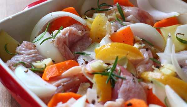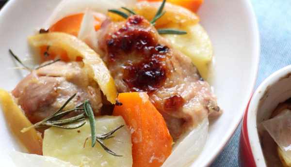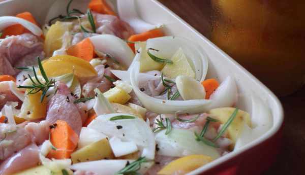 材料:去骨雞腿肉兩片、鹽漬檸檬2/3個、洋蔥、馬鈴薯、紅蘿卜、迷迭香、蒜頭