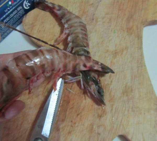 第2步、將大明蝦洗凈後,從背部煎開,挑出蝦線;