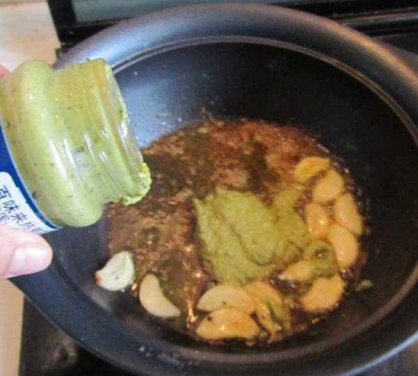 第8步、直接在鍋中放入適量的熱那亞風味調料醬翻炒一下;