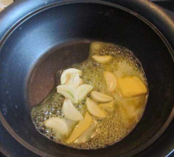 第5步、鍋中放入少量的黃油,下入蒜片;