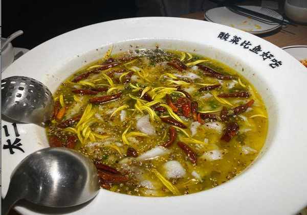 響亮的吆喝聲後,碩大的酸菜魚上桌,酸辣開胃,引人頻頻動筷。