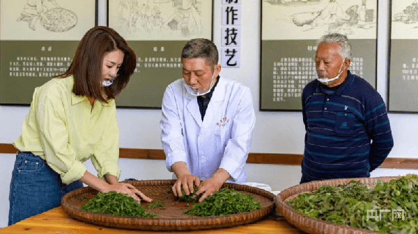 茶葉鋪滿整個桌面,市級非遺項目老鷹茶傳統手工制作技藝代表性傳承人趙長平挑選出鮮葉,熟練地進入制茶環節。殺青、揉捻、曬幹。每到一個環節,趙長平都對手工制茶進行詳細講解,並為直播間的網友們現場展示,“揉得越好,茶的口感才越好。”