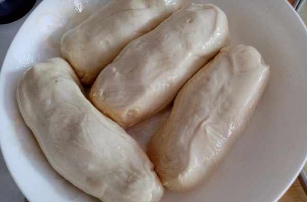 步驟二、半小時後把面團拿出來放在案板上揉成長條後,用刀切成大小均勻的4份,用手把4份面團都分別搓成長條,盤子裡刷一層油,將長條都放入盤子裡,然後用刷子把每個長條表面都刷上油蓋上保鮮膜或蓋子再次醒面30分鐘。