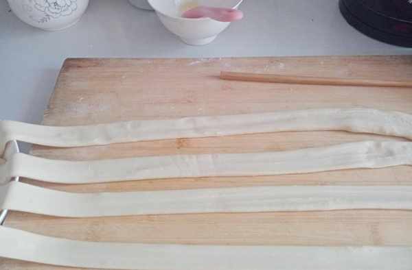 步驟三、等半小時後再把醒好的長條拿出來放在案板上,用手把長條按扁後,然後用手捏住長條的兩端輕輕拉扯後在案板摔打幾下,再把面條對折後往案板上摔打幾下,這樣褲帶面就能拉伸很長,還不會拉斷,如下圖一樣。