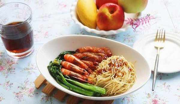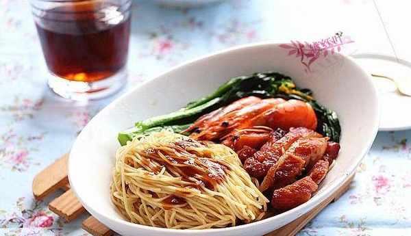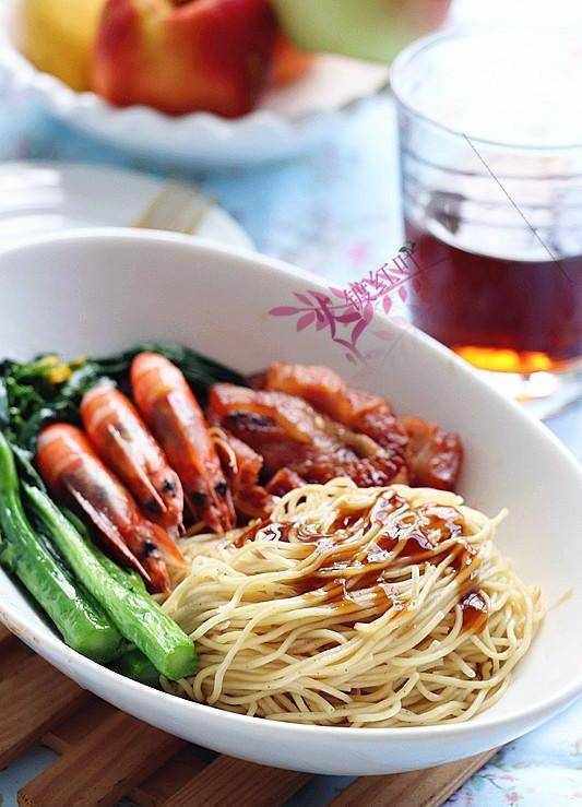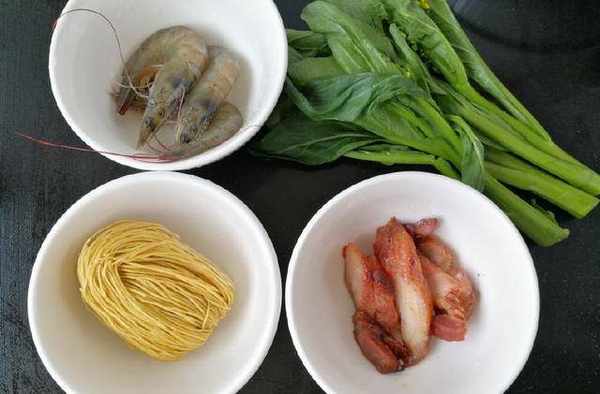 主材料:蝦子面1個,菜心50克,叉燒肉30克,大蝦3隻