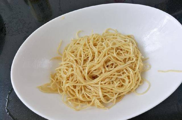 撈起面條盛好,拌上麻油,放一邊待用