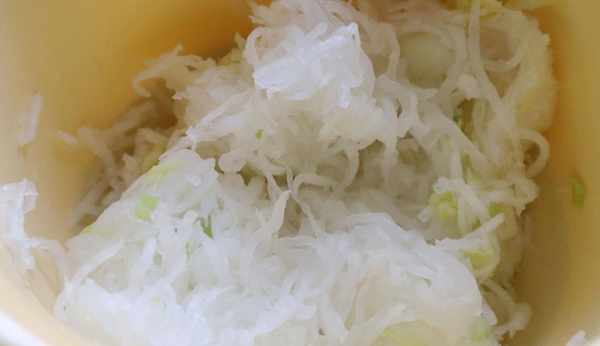 而白蘿卜因為有生味,所以還是要進行處理的,將蘿卜去皮然後借助擦絲器擦成細絲,然後加2勺的鹽巴,醃制出水後攥幹。
