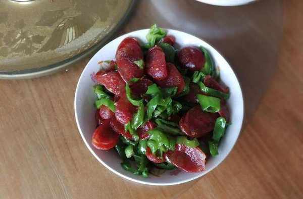 蒸好的香腸切成片,蒜片爆鍋,放入香腸翻炒出油。再放入切好的尖椒段。加醬油、鹽、雞精調味即可。