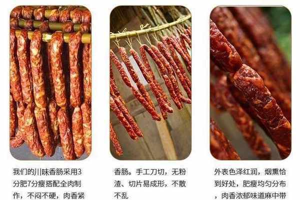 優質的香腸,采用三分肥七分瘦的豬肉,不悶不硬,肉香緊實。手工刀切,無粉渣,切片不散不亂,外表色澤紅潤,煙熏恰到好處,肥瘦均勻分佈,肉香濃鬱,味道麻中帶辣。