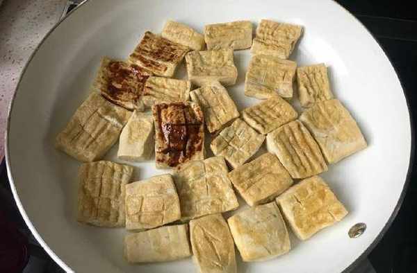 6、平底鍋無需放油,小火燒熱後放入豆腐,煎至一面金黃後,翻面,刷上醬汁,再煎2分鐘,關火。