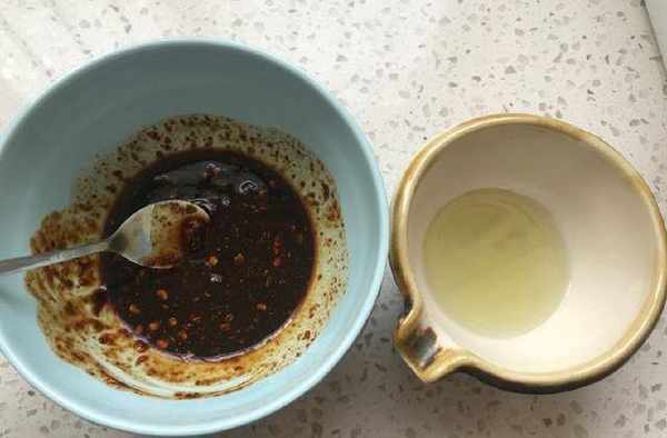 4、生抽、黃豆醬、蠔油、孜然粉、辣椒粉,放入碗裡調成醬汁,橄欖油放碗裡備用,小蔥切碎備用。