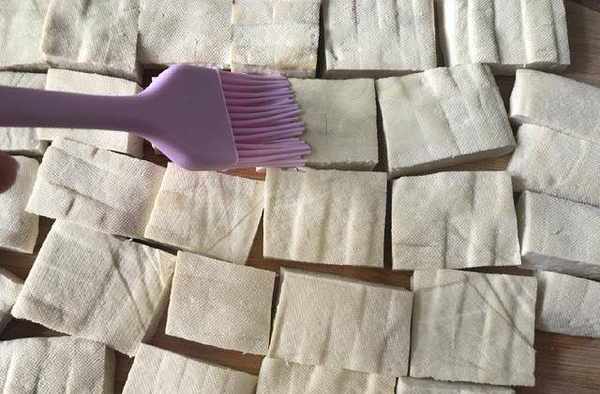5、在豆腐兩面刷上一層植物油。