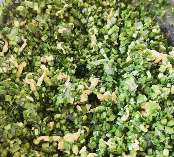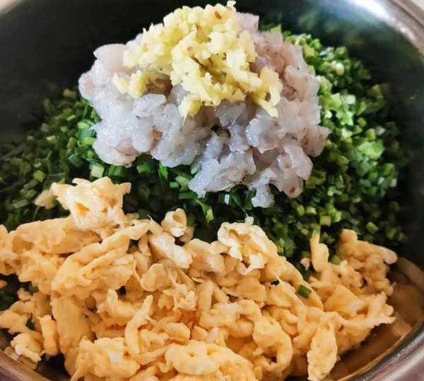 原料:普通面粉、韭菜、蝦仁、雞蛋、薑末、花生油、香油、鹽、雞精、蠔油。