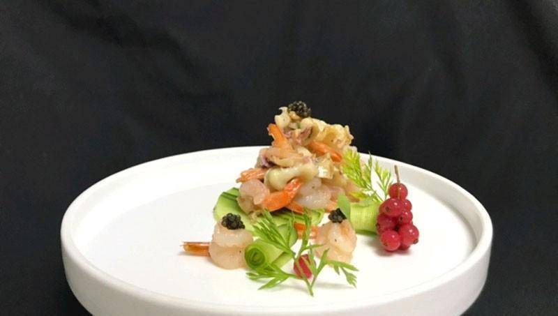 活明蝦300克、海螺一隻、魚子醬5克、紅蘿卜葉2片、黑松露醬5克、鹽8克、芥末油3克、黑松露油10克