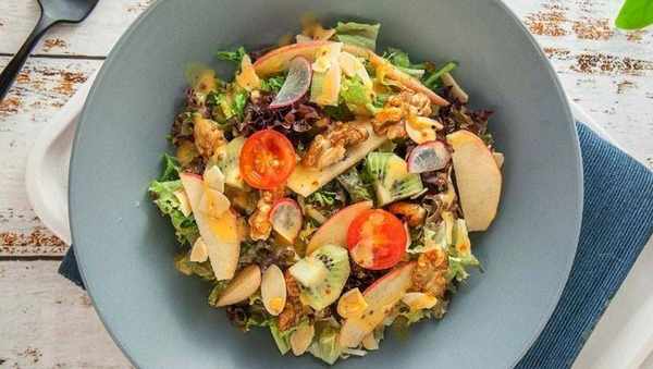 焦糖核桃10克、蘋果片5片、混合生菜50克、腰果10克、奇異果5片、藍莓6個