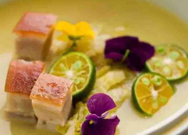 將煮好的五花肉用烤箱160度烤10分鐘,至肉皮酥脆,然後切成小方塊