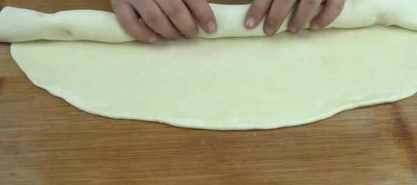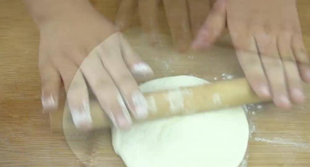 時間差不多到瞭, 取出面團,撒些幹粉防粘。把面團揉搓均勻按扁,搟成一張大約三毫米厚的餅皮就可以,搟好之後刷一層食用油。用油撒些鹽調味,然後按照一樣的方式。選取封口處捏緊。把每個劑子的封口處都捏緊,然後垂直按扁整理成圓形,蓋上保鮮膜二次醒發10分鐘。