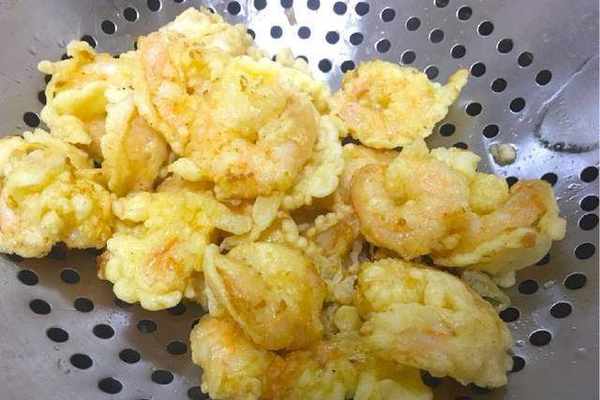 鍋中加入適量的油,油溫四成熱時將裹著面糊的蝦仁下鍋定型,炸至表面微微發黃後撈出控油