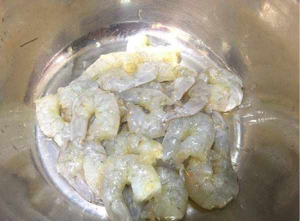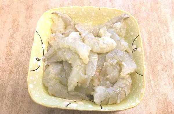 首先準備大蝦、雞蛋、面粉、生粉等原料,大蝦先用剪刀剪掉蝦須和蝦腿,然後去掉頭部,剝去蝦殼,用清水洗一下