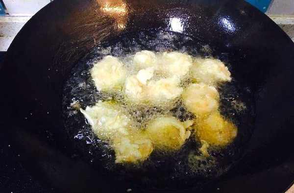 把油溫升高至七成熱,倒入蝦仁再復炸一次,復炸的目的可以使炸出來的蝦仁更加的酥脆