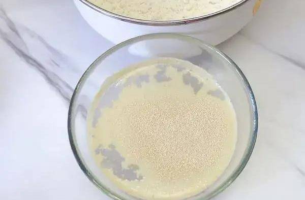 2.取一個小碗倒入少量溫開水,倒入5克左右的酵母粉,在溫水中充分攪拌至酵母粉完全融化,倒入和面的盆裡備用。一定不能用太燙的水,水溫太高會破壞酵母中的成分,溫水可以加快酵母粉的發酵。