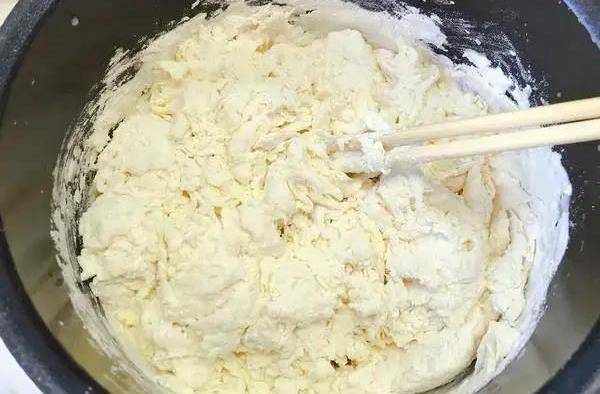 3.將面粉倒入攪拌均勻的酵母水中準備和面,邊倒面粉邊用筷子勻速攪拌。這一步用筷子主要是為瞭不讓手直接接觸水和面粉,就不會粘到滿手的濕面粉瞭。