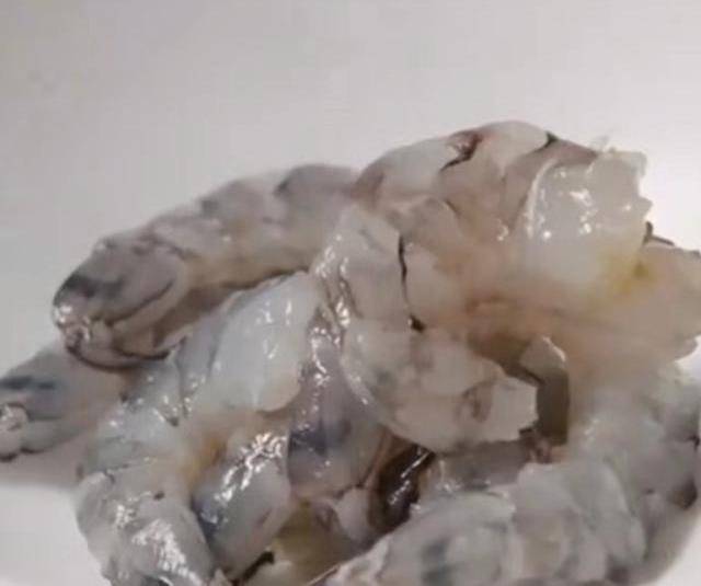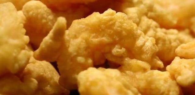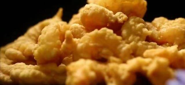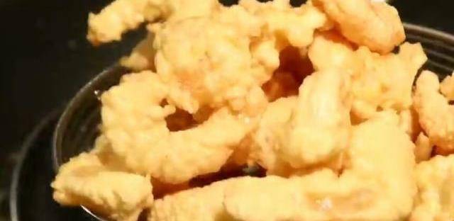 3、蝦仁進行復炸(20-30秒),油溫不要太高,4-5成熱即可;通過復炸,能將初炸時吸入的油脂逼出;