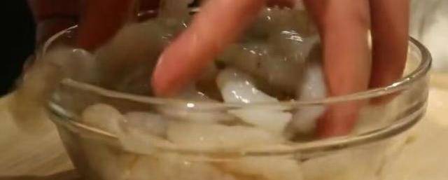2、將處理幹凈的蝦仁放入調味容器中,加入少許的蔥薑水,適量的鹽、胡椒粉,輕輕抓揉,醃漬10分鐘待用;
